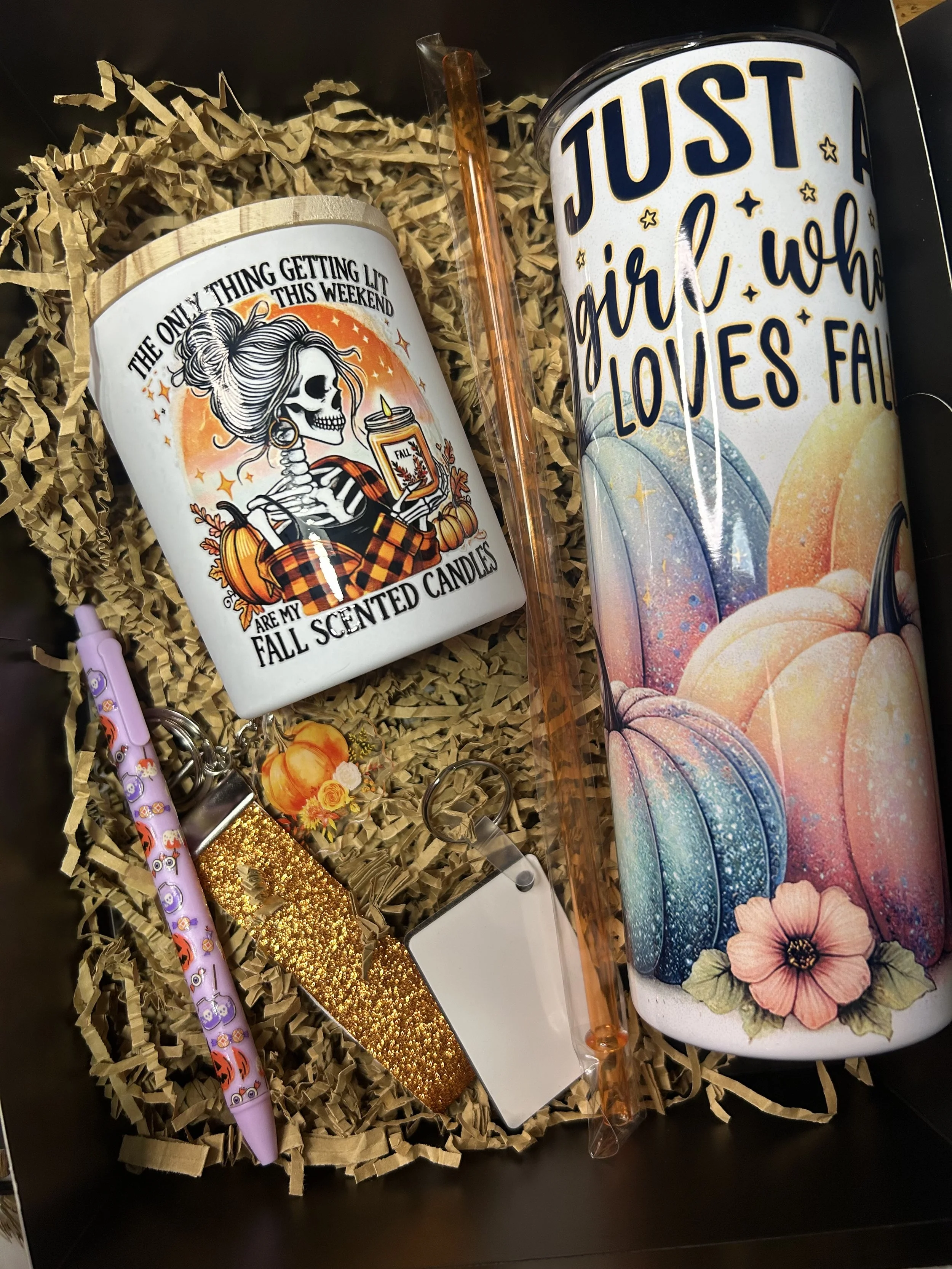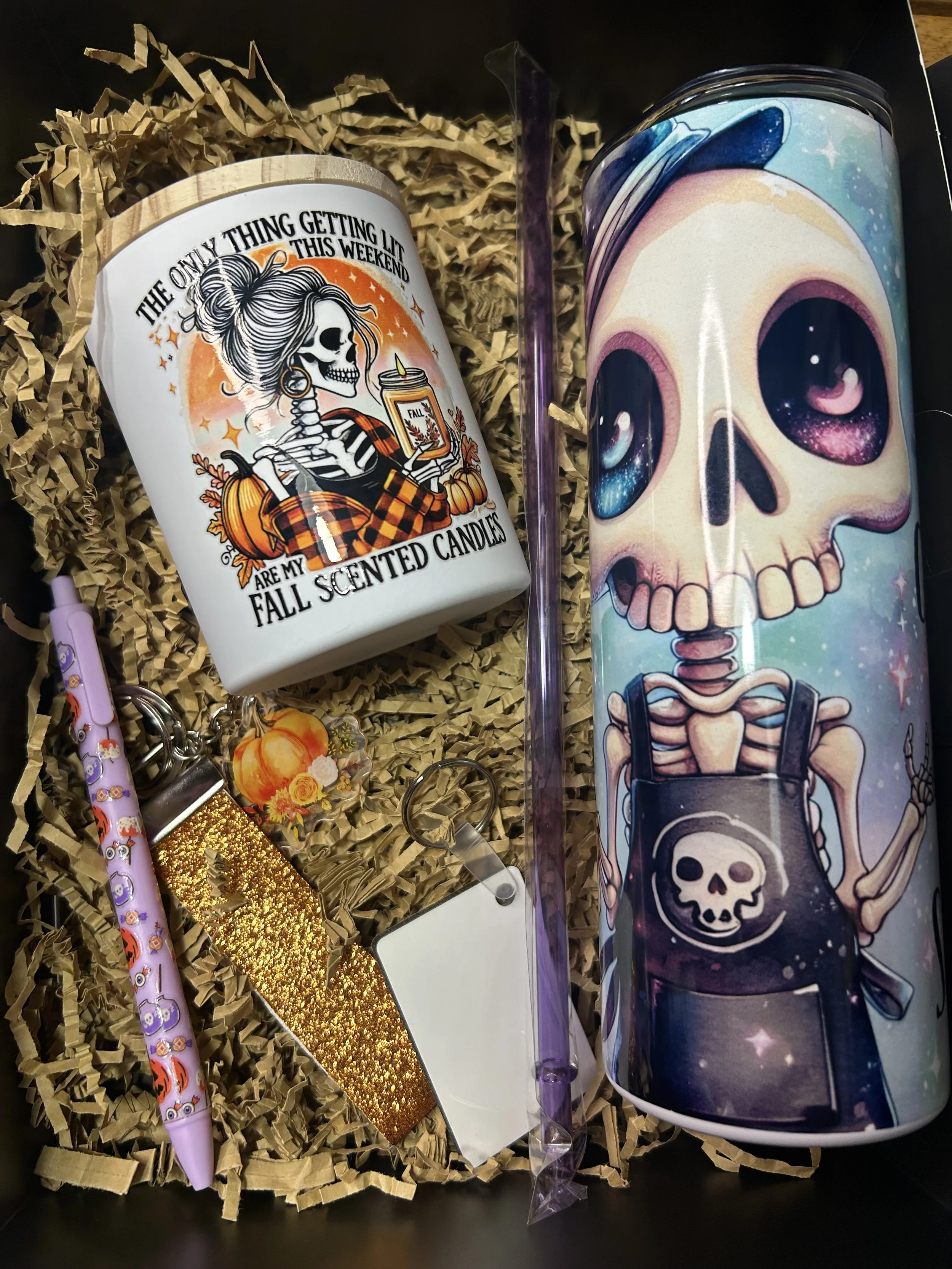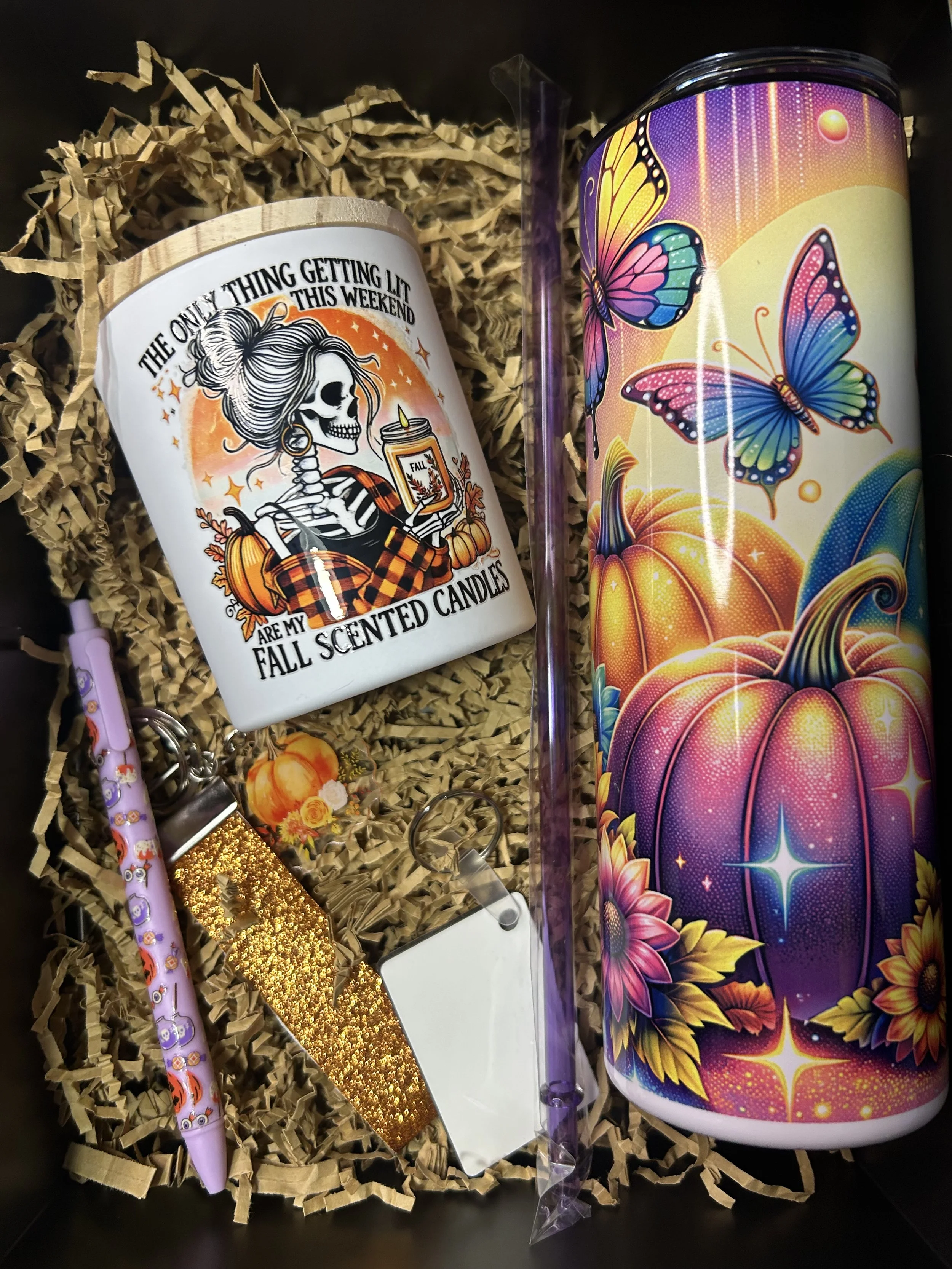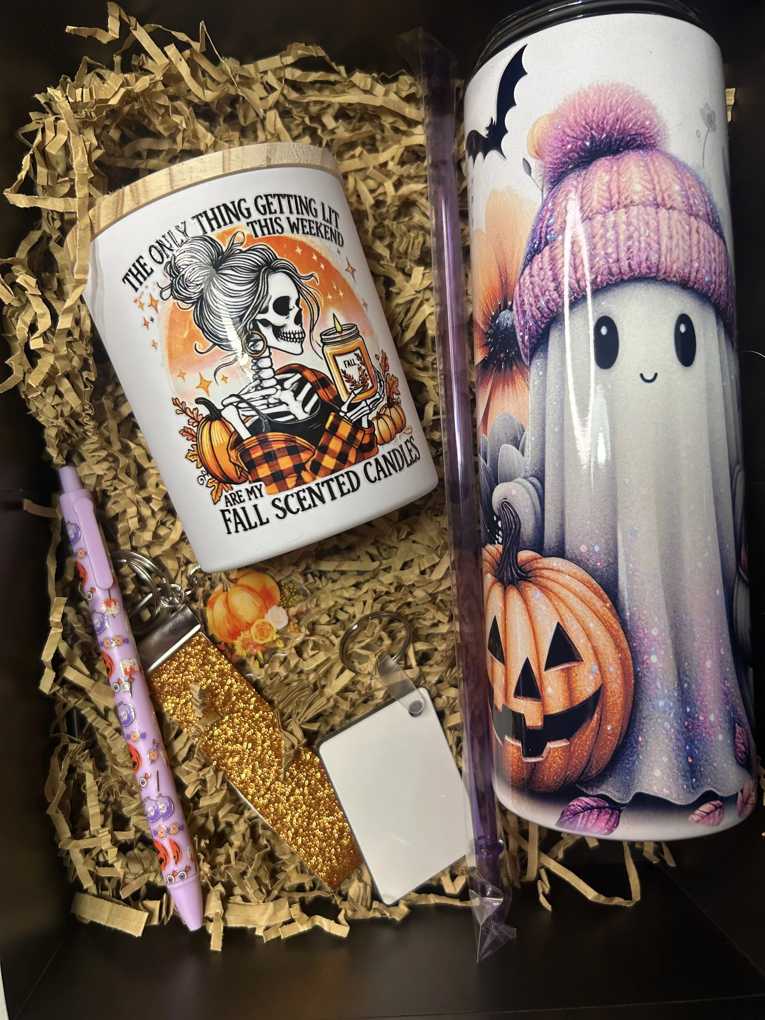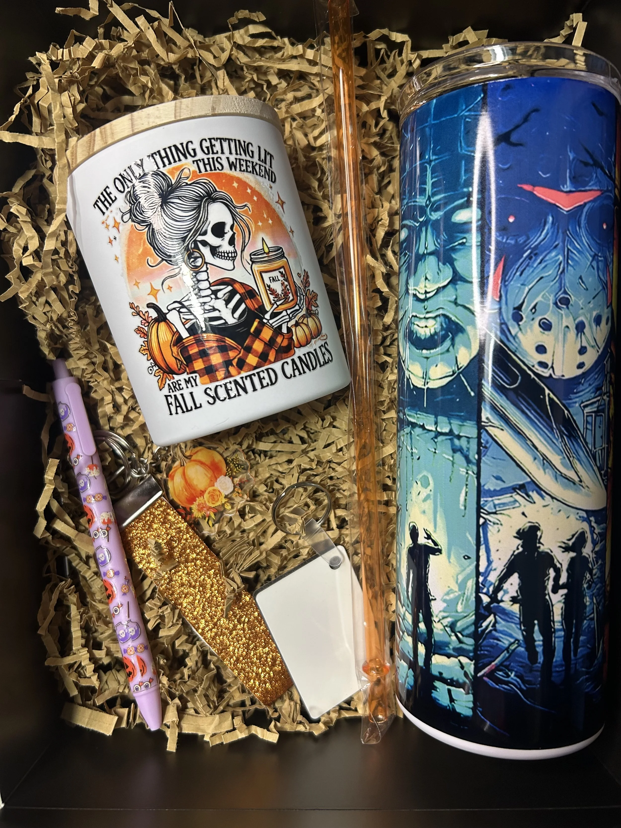 Comes with a fall/halloween themed 20oz tumbler(choose from options pictured), a homemade 10oz candle, 2 accessories and a keychain that you can customize front and back.