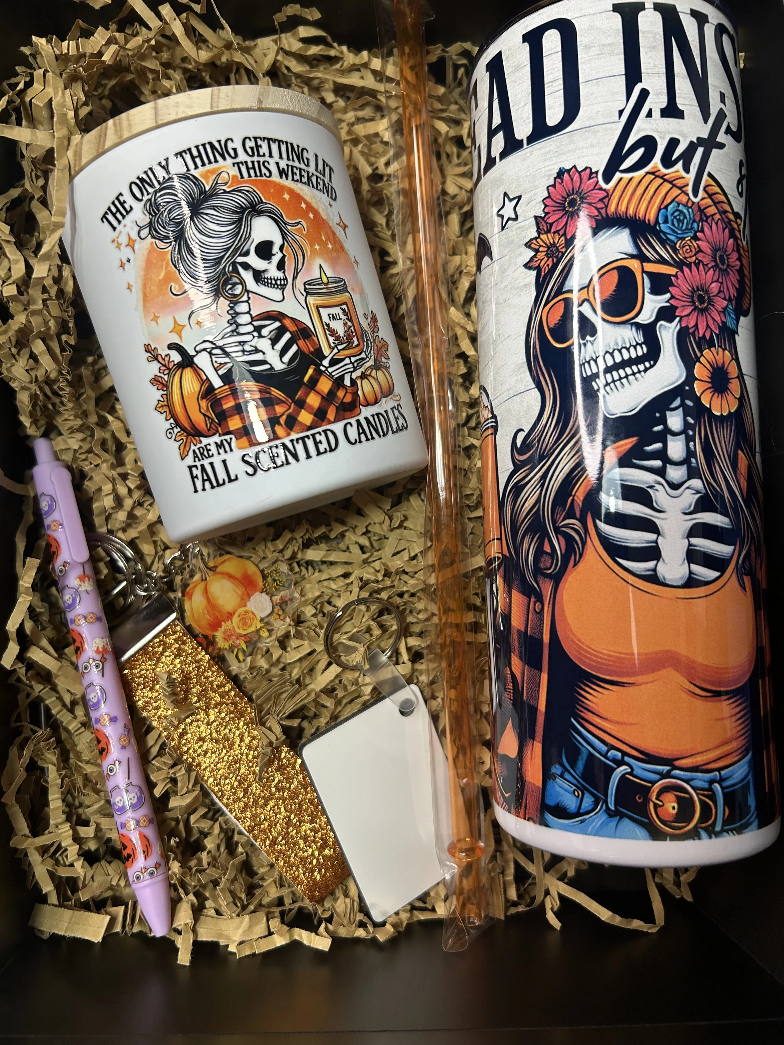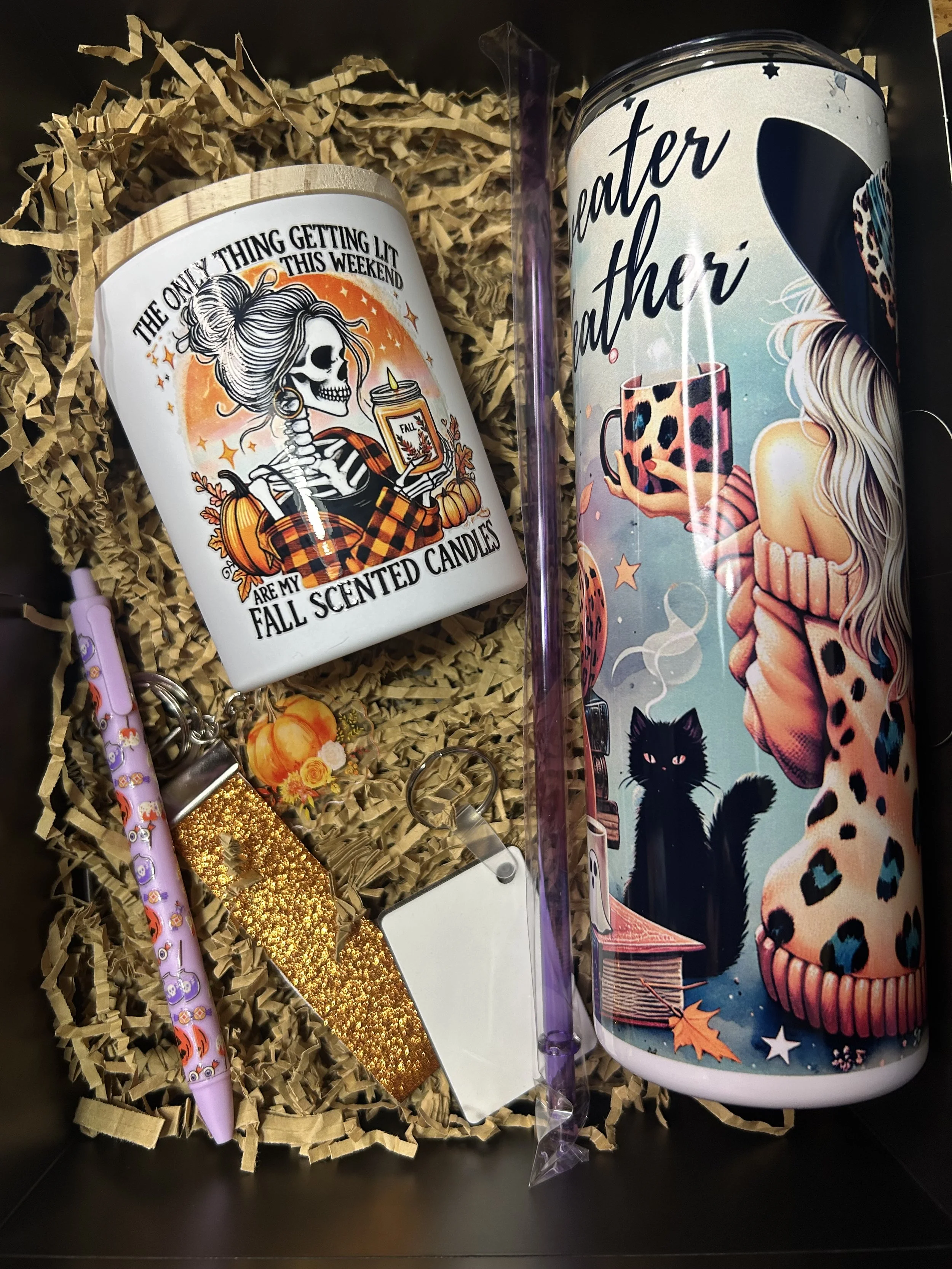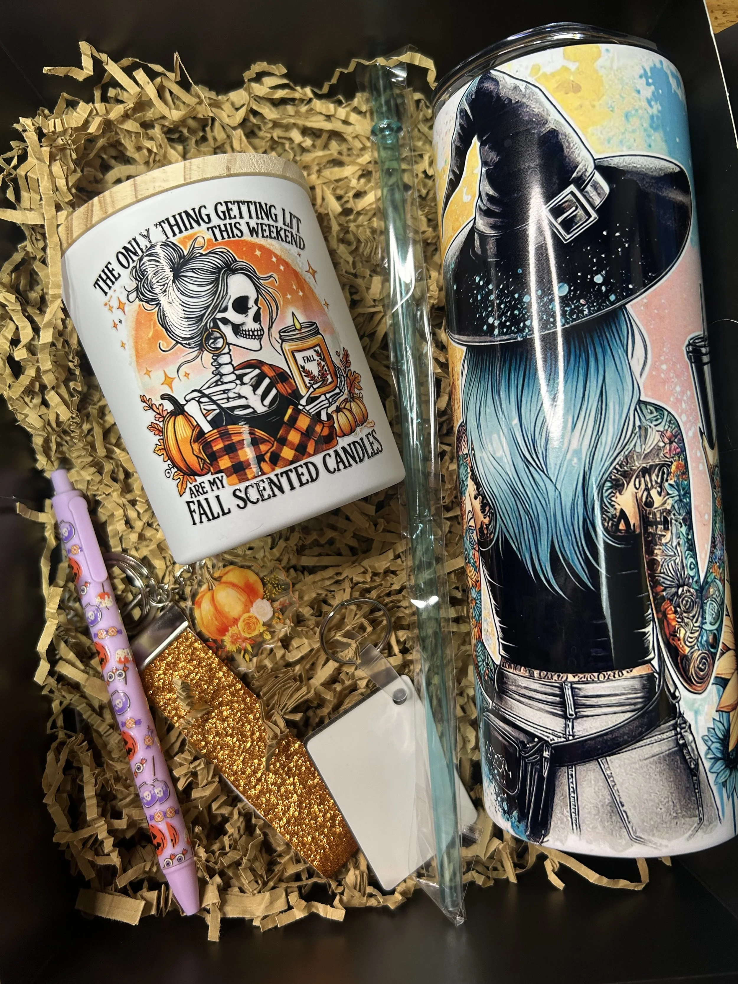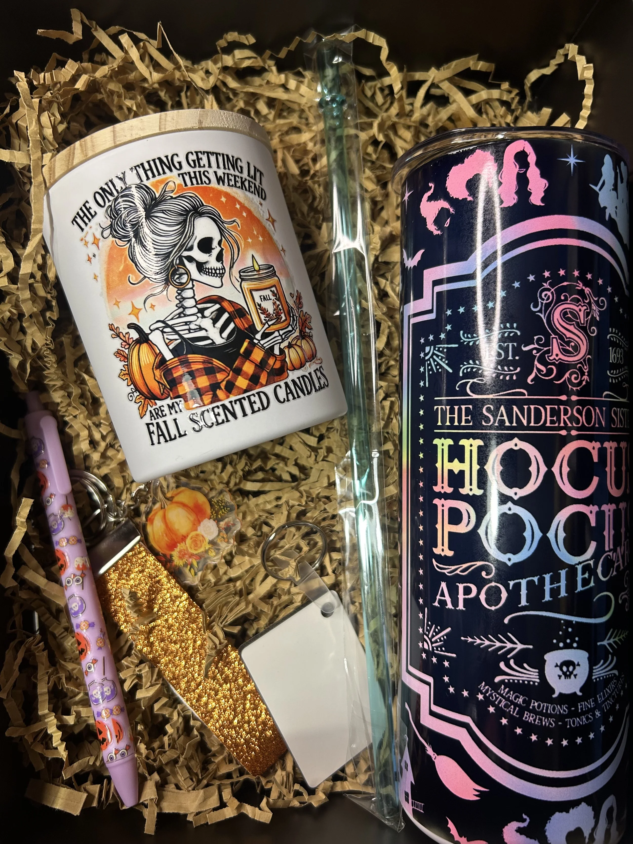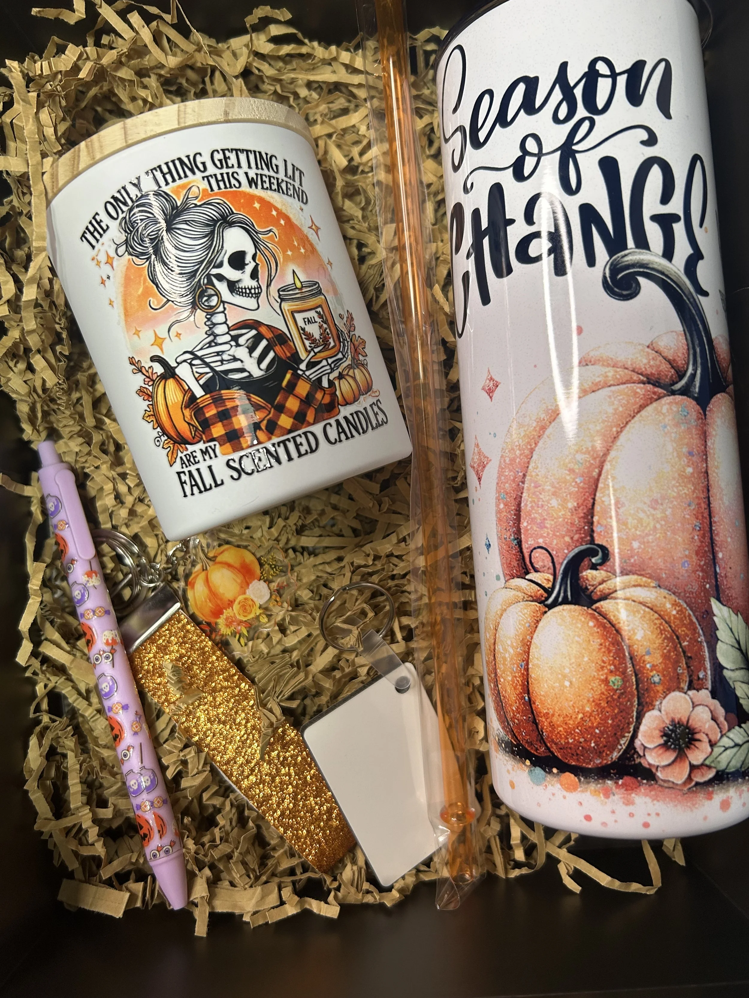 Comes with a fall/halloween themed 20oz tumbler(choose from options pictured), a homemade 10oz candle, 2 accessories and a keychain that you can customize front and back.